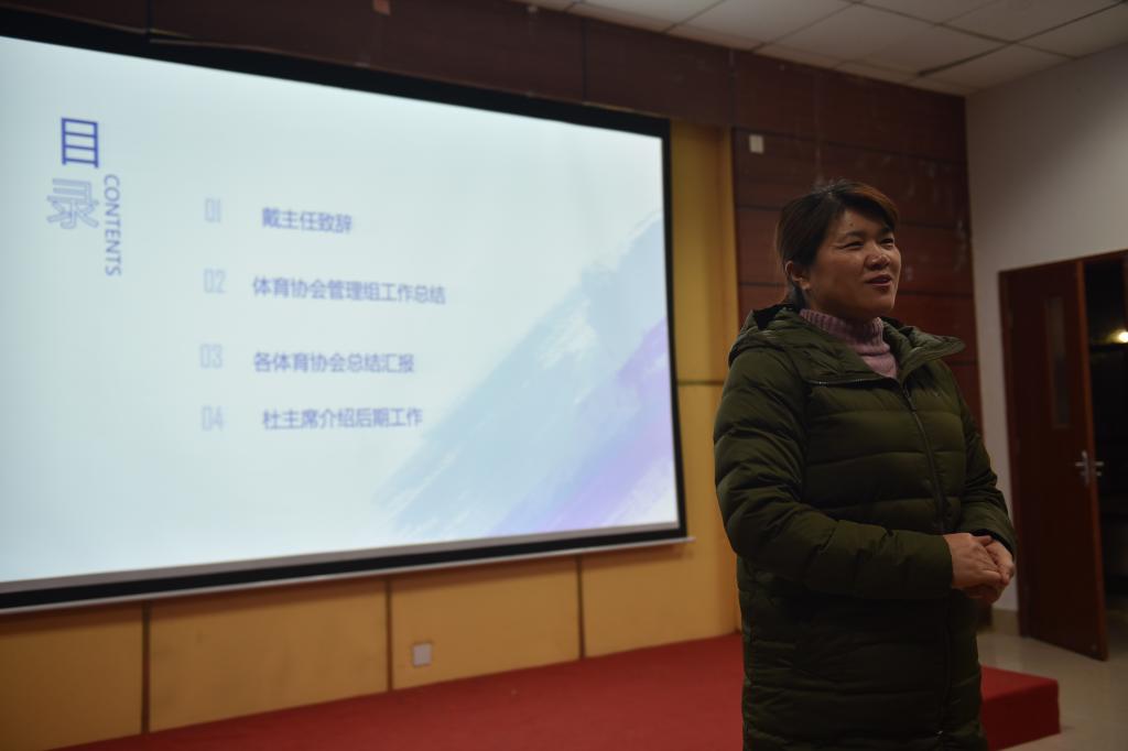 首先,戴平致开幕词。她指出,在过去的一年里,体育类协会的数量持续稳定增长、所办活动变得丰富多彩、内部氛围和谐融洽,她对各位指导老师、社团管理组成员及各位协会负责人的刻苦付出和认真工作表示肯定,并希望各个社团负责人在新的一年里,能够总结前一年的工作基础之上,不断地发挥各自社团的优势,她提醒大家重视自身学业学习,全面发展,并祝愿大家在新的一年里带领各自社团取得更大的成绩。
