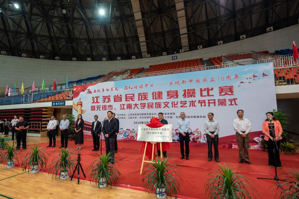 上午九点,开幕式在江南大学体育馆举行。无锡市委常委、统战部部长陈德荣、江苏省民宗委副主任徐刚和校党委常委、副校长吴正国及省、市、校职能部门负责人出席,无锡市民宗局副局长程鹏主持了开幕式。吴正国致欢迎辞,江苏省体育局群体处副处长周玲美宣读《关于同意在江南大学设立“江苏省少数民族传统体育项目训练基地”的批复》;徐刚为江南大学江苏省少数民族传统体育项目训练基地揭牌。在运动员代表和裁判员代表宣誓后,陈德荣宣布江苏省民族健身操竞赛正式开幕。