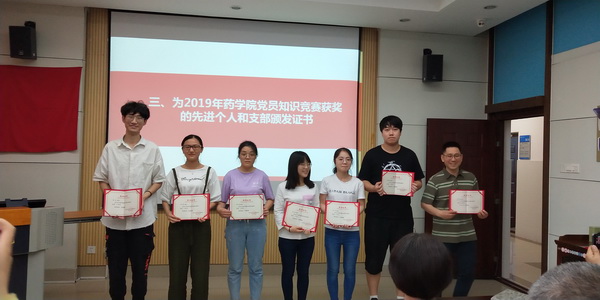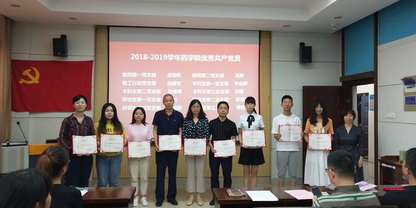 大会着重对2018-2019学年药学院“先进党支部”、“优秀共产党员”进行了表彰。经各党支部民主推荐、参照年度考核评优成绩,由党委会讨论决定,药学院教师第二党支部、本科生第二党支部荣获“先进党支部”荣誉称号,吴静、秦兰等10位师生获“优秀共产党员”荣誉称号。吴静同志作为优秀共产党员代表发言,她总结了自己一年来在投身学术科研和助力学院发展中的进步与不足,认为作为高校党员教师应该在思想积极追求进步,重视学术交流、团队合作和指导学生成长,她还积极倡议与会党员凝心聚力,为药学院的持续发展添砖加瓦,为鲜红的党旗增光添彩。孙雅婕同志代表本科生第二党支部从组织建设、理论学习、特色创建、存在问题等方面进行了交流展示,分享了支部建设的成果、不足以及下一阶段的工作设想。