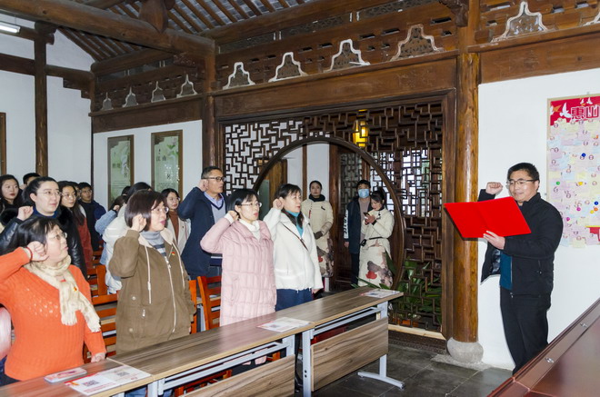 随后,全体党员来到了惠山古镇省级廉政文化教育基地会议室,观看廉政视频,体悟“不矜细行,终累大德。为山九仞,功亏一篑”的清廉道理,抄写《爱莲说》,分享学习感言,并在党委副书记白冰的带领下举起右手、庄严宣誓,重温入党誓词。
