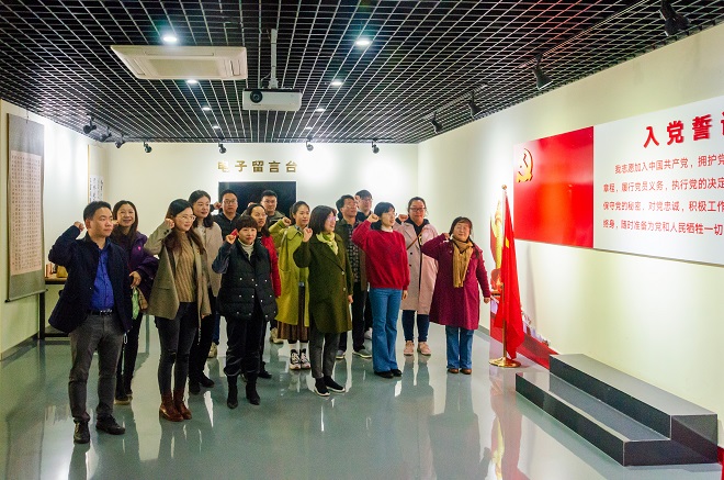 首先,教师们集中参观了山联村党建教育基地馆。馆内记录了山联村从贫穷偏僻的小山村发展成为最美乡村的奋斗史,记录了全村干部群众艰苦创业共同致富,把贫困村建设成社会主义新农村的全过程,记录了山联村党总支以特色党建引领各项事业发展,构建形成了加持红色方向标、建设绿色宜居地、迈向金色康庄道的“三色”党建工作模式。通过参观和聆听讲解,大家深切感受到在中国共产党的领导下山联村发生的翻天覆地的变化,激发了广大党员和教职工爱党敬业的工作热情。全体党员还在山联村党建教育馆内的党旗前进行了集体宣誓,重温入党誓词。