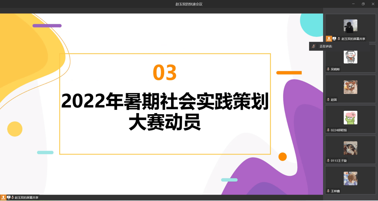 最后,王珏介绍了今年暑期社会实践策划大赛的相关情况,结合“喜迎二十大、永远跟党走、奋进新征程”主题,建议同学们从八个分主题、七条实践路线入手,在遵守当地新冠肺炎疫情防控的相关部署和学校疫情防控要求的前提下开展实践调研活动,为自己的大学生活增添一段难忘的时光。