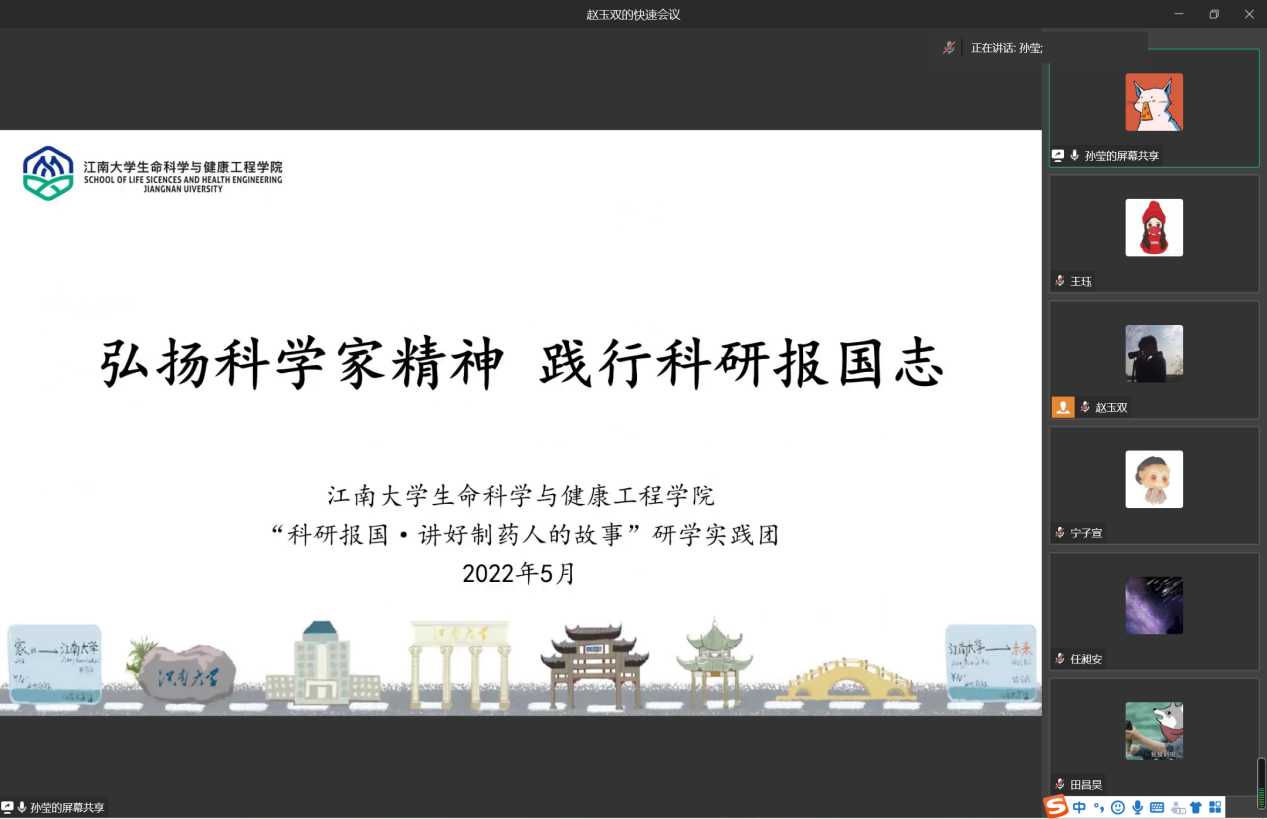 生命科学与健康工程学院“科研报国·讲好制药人的故事”研学实践团的孙莹队长介绍了团队秉持“弘扬科学家精神,践行科研报国志”的初心,开展“讲好制药人的故事”系列宣讲课程、“荣药课堂”暑期科技夏令营、“名企有约”知名药企面对面等系列活动,让团队成员感受到此次实践更像是一堂“行走的思政课”,团队成员在这堂大课中共同学习、磨砺、成长。