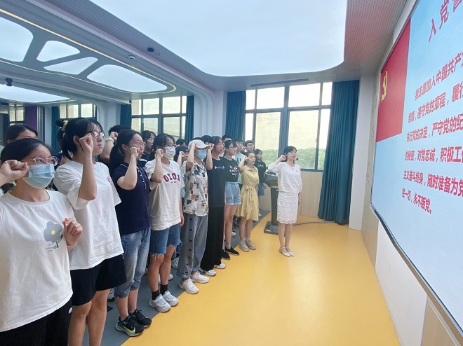 随后,在专职组织员葛玲的带领下,2022年新党员举起右手、庄严宣誓,老党员借此机会重温誓词。孙莹同学作为新党员代表进行发言。她表示,作为新时代的中国青年,生逢盛世,更要肩负重任。要用党的创新思想和科学理论武装头脑、指导成长,做习近平新时代中国特色社会主义思想的坚定信仰者、忠实践行者,不负青春、不负韶华,努力成为堪当民族复兴大任的时代新人,让青春在为祖国、为民族、为人民的不懈奋斗中绽放绚丽之花。