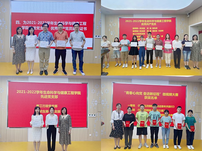 党课结束,“七一”新党员宣誓仪式正式开始。全体师生党员起立,奏唱国歌。首先由学院副院长吴静宣读《关于表彰生命科学与健康工程学院2021-2022学年先进党支部和优秀共产党员的决定》,她希望受到表彰的支部和个人珍惜荣誉、谦虚谨慎、戒骄戒躁、奋发进取,进一步坚定理想信念,在推动学校、学院事业科学发展的进程中更好地发挥党支部的战斗堡垒作用和党员的模范带头作用。陈霞雯为获奖师生颁发荣誉证书。学院分团委书记王珏宣读“青春心向党,奋进新征程”微视频大赛获奖名单,蒋艳为获奖人员颁发荣誉证书。为展示优秀,大会进行了获奖微视频展播。