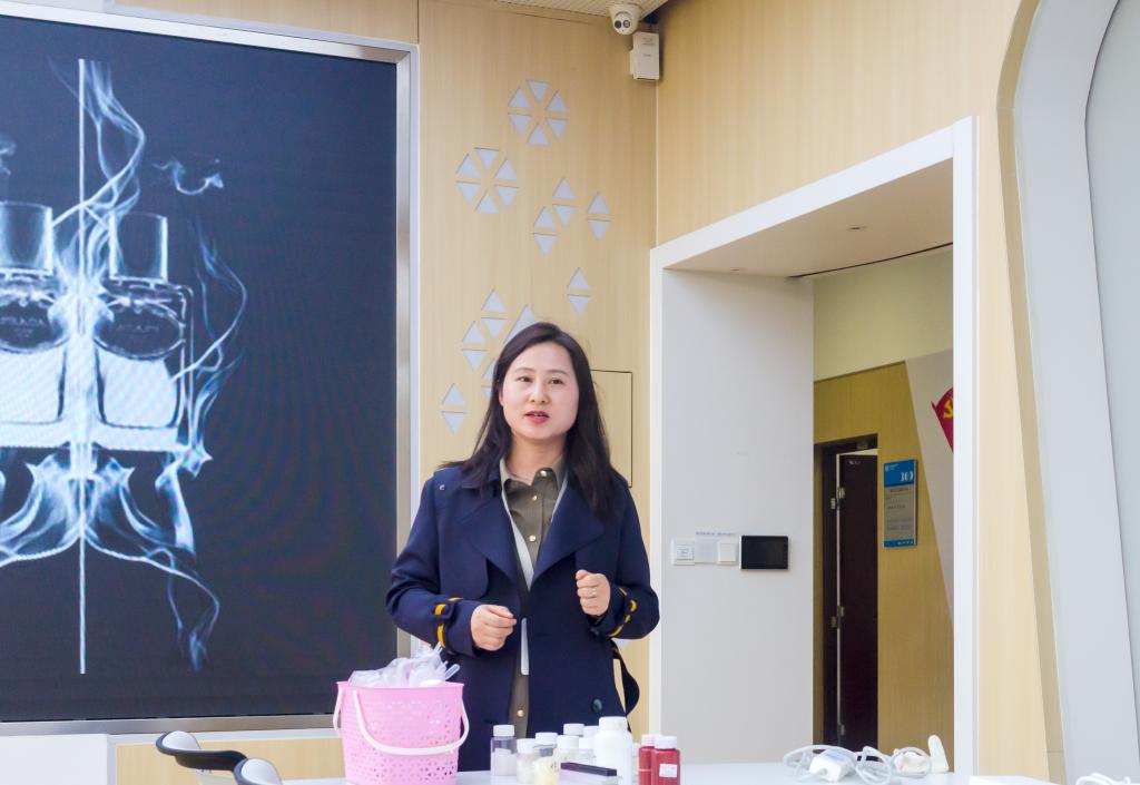 活动伊始,储鸿向大家介绍了香水文化、各种常见香型的特点、以及香水的使用礼仪和选购等知识。随后,陈凤凤从口红的制作步骤、选色原则、调制成分的用量和手工制作的注意事项等方面进行了详细说明。女教工们认真聆听,兴致盎然。
