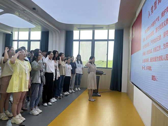 在专职组织员葛玲的带领下,2023年新党员及与会党员的党员师生,面对鲜艳的党旗庄严宣誓,立下承诺,愿为共产主义事业奋斗终生。冯丹婷同学作为新党员代表进行发言。她表态将与全体党员同志一起,把入党作为学习和工作的新起点、加油站,不断追求思想和学习工作的更大进步,勇往直前,不负使命,不负青春。