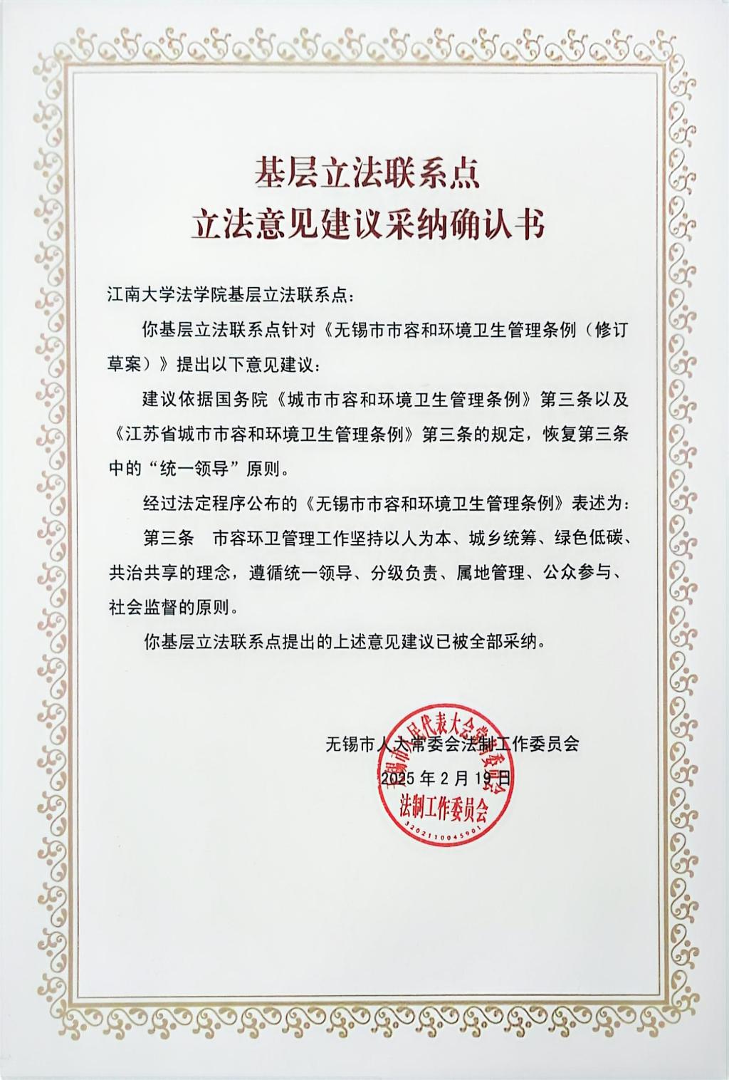 法学院自2022年被确立为无锡市人大常委会基层立法联系点以来,始终秉持积极作为的态度努力拓展合作网络,已与50余家立法单位、立法信息采集点建立了广泛而深入的联系。学院广泛参与无锡市人大常委会推进的地方立法工作,先后出席规范性文件备案审查等立法会议10余次,对《无锡市市容和环境卫生管理条例》《无锡市和美乡村条例》《无锡市居家养老服务条例》等地方性立法提出了20余条具有建设性的立法意见和建议。其中针对《无锡市市容和环境卫生管理条例》提出的意见建议得到了采纳,并获得了无锡市人大常委会法制工作委员会的高度评价与肯定。