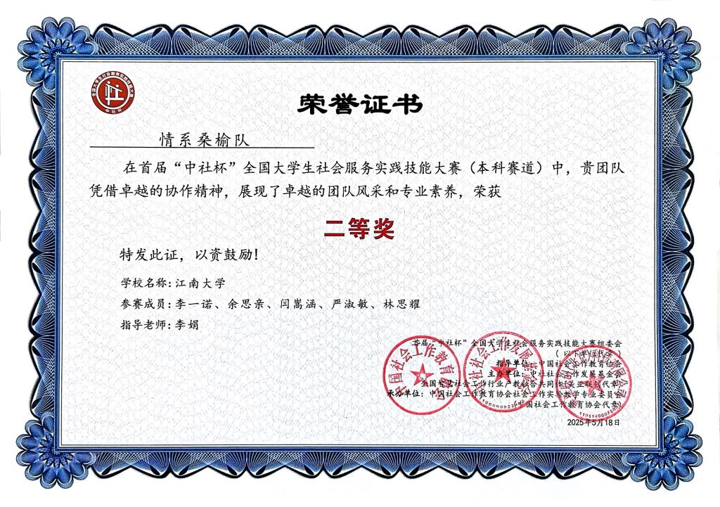“情系桑榆”团队由法学院李娟老师指导,由2022级社会工作专业本科生李一诺、余思亲、闫嵩涵、严淑敏、林思耀共同参赛。在初赛阶段,团队围绕老年服务群体需求,以“忆启晨光:老年人脑健康关爱大型科普宣传项目”为主题撰写作品,从调研设计到服务落地,充分展现了青年学子对为老服务需求的深刻洞察与人文关怀。在复赛阶段,团队通过情景还原、服务流程演示等方式,进一步传递“科技赋能+温情守护”助力老年人安享晚年的创新理念。最终,团队凭借扎实的社会服务实践与创新的服务方案,成功入围全国总决赛。