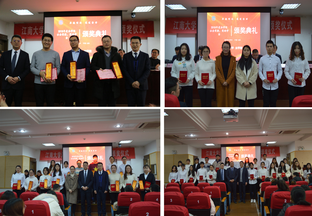 杨杰首先致辞,他表示法学院与海辉律师事务所、君澜律师事务所、新吴区社会工作协会在合作理念方面高度契合,也表达了对各方长期以来给予学院的关注和支持表示衷心感谢。接着,法学院党委书记杨杰、君澜律师事务所创始人瞿俊鹏律师作为双方代表签订《江南大学法学院、君澜律师事务所“君澜奖教、奖助学金”捐赠协议》;并由瞿俊鹏律师发言,介绍了君澜律师事务所的经营特点和律所文化、理念,对于法学院学子赴君澜律所实习及就业表示极大的欢迎和支持。王君柏宣读了法学院2018年度“社会奖教、奖助学金”获奖师生名单。随后,海辉律师事务所合伙人许雪松律师、无锡市新吴区社会工作协会王文进秘书长、君澜律师事务所创始人任华律师等相继发言,同时为获奖师生进行颁奖并留影,本次颁奖一共有7个奖项,获奖师生56人。最后由华一楠同学作为获奖学生代表登台发言,表达对资助单位机构和学院的感谢,并表示会更进一步取得更好的成绩回馈母校和社会。