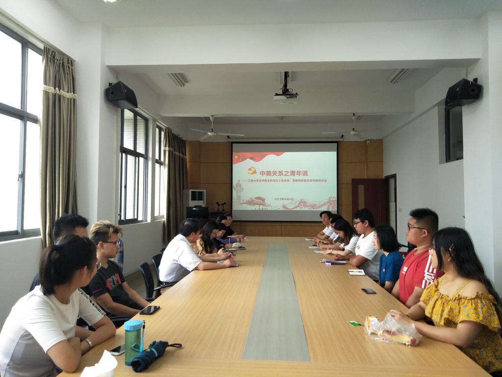 会议伊始,本科生社工党支部代表夏守建从中美贸易结构、政策法规等方面论述了当下紧张的中美关系背后的逻辑,通过华为近期的遭遇分析指出近期中美之间的争端绝不仅是贸易逆差的问题,而是两个国家、两个民族对于前途命运的博弈。社工党支部党员林慧灵则通过回顾中美建交40年来的两国关系和战略定位的发展变化指出:“目前,中美关系逐渐走向成熟,但仍在亚太军事力量布设与基层社会敌视态度上呈现较大脆弱性和战略误判的风险。现如今,中美关系进入了一个合作与竞争同时增强、国内因素对两国外交影响加大的“新常态”,中美双方应专注于建立“共同进化”的关系,减少冲突。”