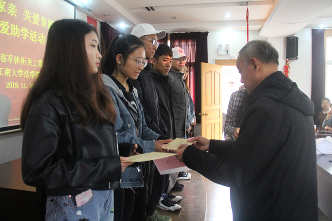 最后,少数民族学生代表游义发言,对法学院少数民族学生的学习生活进行汇报,同时表示:“我们与钱巷军休所的结缘对我们每位同学而言意义非凡。你们不仅帮助我们改善我们的物资生活。而且也关注我们的学业生活,关注我们的身心发展问题,抽空在节假日或者空闲时间来看望我们,传递爱心,让已在他乡的我们感觉到有那么一群人在默默的关心着我们、关爱着我们,让我们感到倍加的温暖。你们的小善举,温暖我们一大群。今后我们会更加努力提高自己各方面的能力,以自己优异的成绩报答钱巷军休所对他们的关怀和付出。同时,在接受你们帮助的同时,将这份爱继续传递帮助更多的人,回馈社会、报效祖国。”