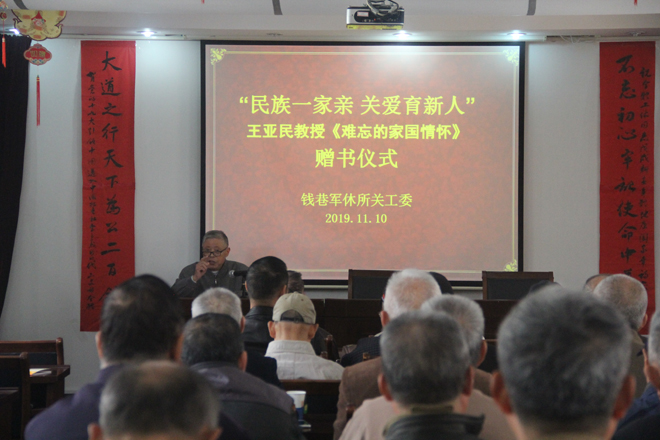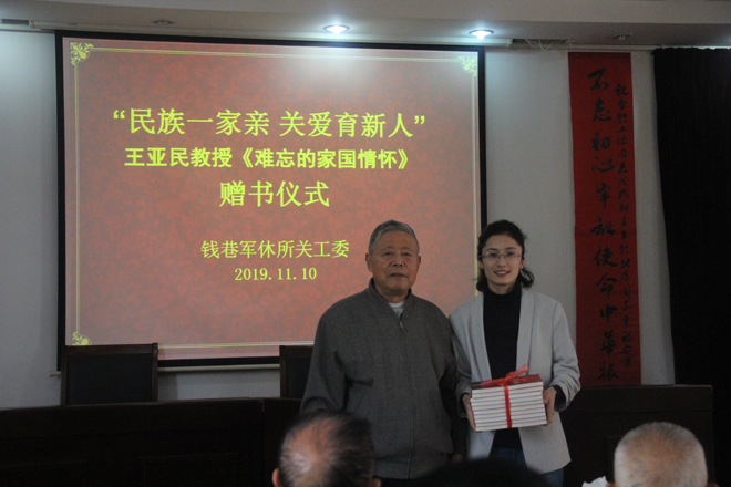 紧接着,军休干部代表赠送读书卡给民族生,王亚民教授赠与民族生著作《难忘的家国情怀》,并在书里亲笔写下对民族生“广泛阅读书籍,成为祖国栋梁”的厚望。随后,王亚民教授发言,对民族生进行亲切问候并表示:“结对帮扶少数密支那组学生是充分发挥军休所老干部的独特优势,加强对民族生的民宗政策宣传、思想政治教育、精神文化熏陶,资助物质生活,帮助民族生扣好人生第一粒扣子,促进民族交融的有效窗口”。他指出“青年智则国智,青年强则国强,青年学生应好好学习,练就本领,建功新时代。希望之后能够增加彼此之间接触的机会,以便增加彼此之间的感情和了解,进行思想上的关怀、生活上的关爱、学习上的关心。”