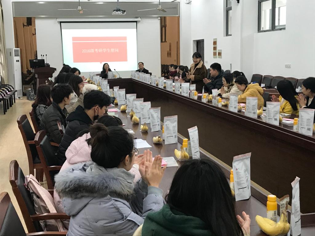 王君柏对大家志存高远、拼搏进取的精神给予了高度赞赏,鼓励同学们克服压力、注意饮食和营养,争取以最好的状态迎接考试,动员大家充分准备、不要弃考,奋战至最后一刻。张慧琪鼓励同学们要有破釜沉舟的决心和勇气,相信坚持就是胜利,表示只有拼尽全力完成最后的冲刺,才不会给自己的大学生涯留有任何遗憾。勉励同学们在这最后的几天里,积极备考,调整心态,并预祝同学们金榜题名。同时学院为每位考研学子分发了水果、牛奶等慰问品,希望在寒冷的冬天能让备战考研的莘莘学子充分感受来自学院的温暖和支持;考研学子也纷纷表示,值此临考之际,学院送来的考研慰问品给他们带来了满满的鼓舞和信心,纷纷表达尽最大努力积极备考的决心。