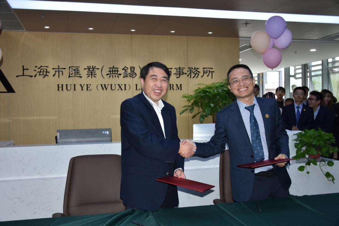 10月18日下午, 江南大学法学院—上海市汇业(无锡)律师事务所 “江南大学教师实践基地”“江南大学学生实习基地”“江苏省知识产权法(江南大学)研究中心协作单位”签约暨揭牌仪式在上海市汇业(无锡)律师事务所隆重举行。无锡市新吴区司法局党委委员、副局长黄娅,江南大学法学院党委书记杨杰,副院长(主持工作)王君柏,党委副书记张慧琪,副院长兼江苏省知识产权法(江南大学)研究中心主任叶敏,汇业律师事务所全球管委会主席杨国胜,汇业党总支书记廖明涛,汇业无锡办公室主任周晓及汇业无锡办公室管委会主任王学华及合伙人等共同出席了此次活动。