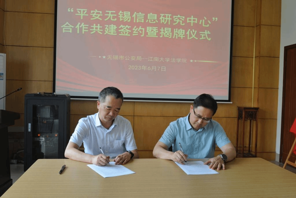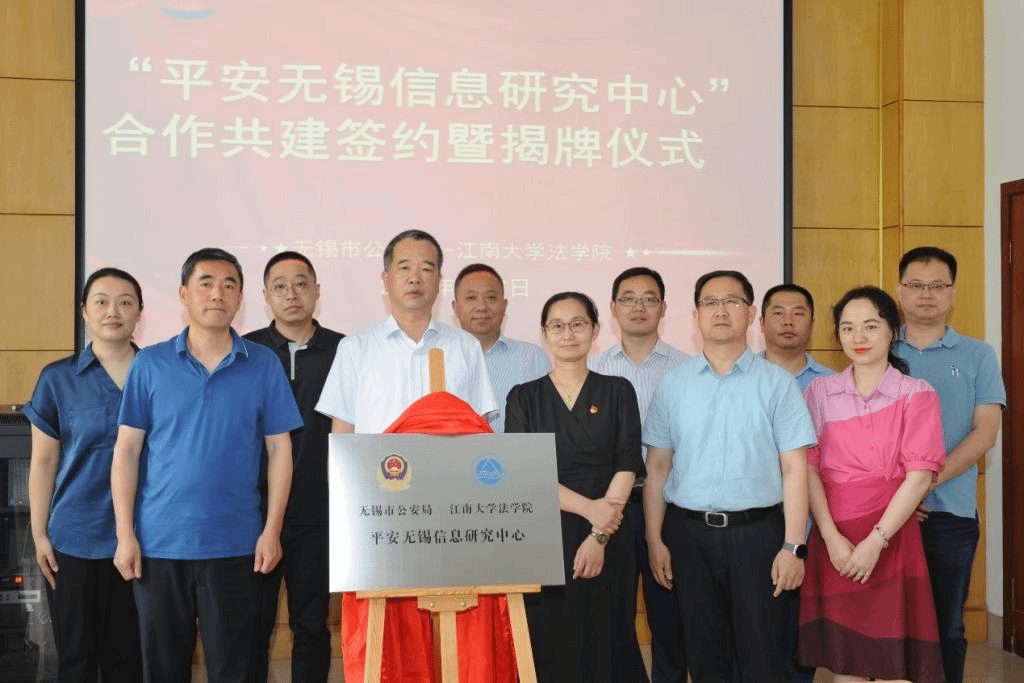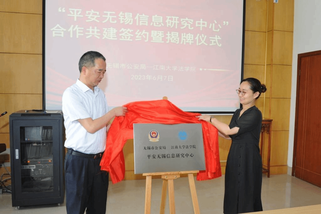 为进一步深入学习贯彻习近平新时代中国特色社会主义思想,落实党的二十大精神,协同地方打造平安无锡、提升公安机关执法公信力,促进法治无锡建设呈现良好态势,6月7日上午,江南大学法学院与无锡市公安局举行“平安无锡信息研究中心”合作共建签约暨揭牌仪式。无锡市公安局党委委员黄建军,江南大学法学院党委书记陆敏芝,院长王君柏,副院长叶敏、法律系主任梅锦,社会学系支部书记王沛沛,社会学系主任汪冬冬等参加了本次活动。