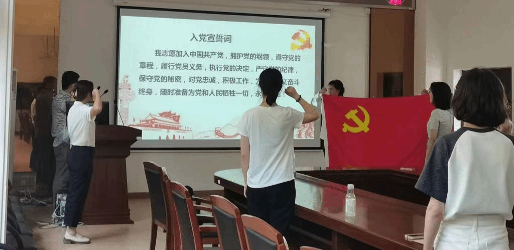 宣誓仪式在庄严的《国际歌》中开始,胡博宣读了《关于接收胡星宇等73位同志为中国共产党预备党员的决议》。随后,优秀学生党员聂国庆带领各位预备党员面向党旗庄严宣誓,努力为党旗再添新彩,为党的事业再立新功。新党员代表金钰和优秀学生党员聂国庆,纷纷表示作为一名新时代的中国青年,要做走在时代前列的奋进者、开拓者和奉献者,用美好青春诠释共产党人的初心使命,谱写新时代的青春之歌。