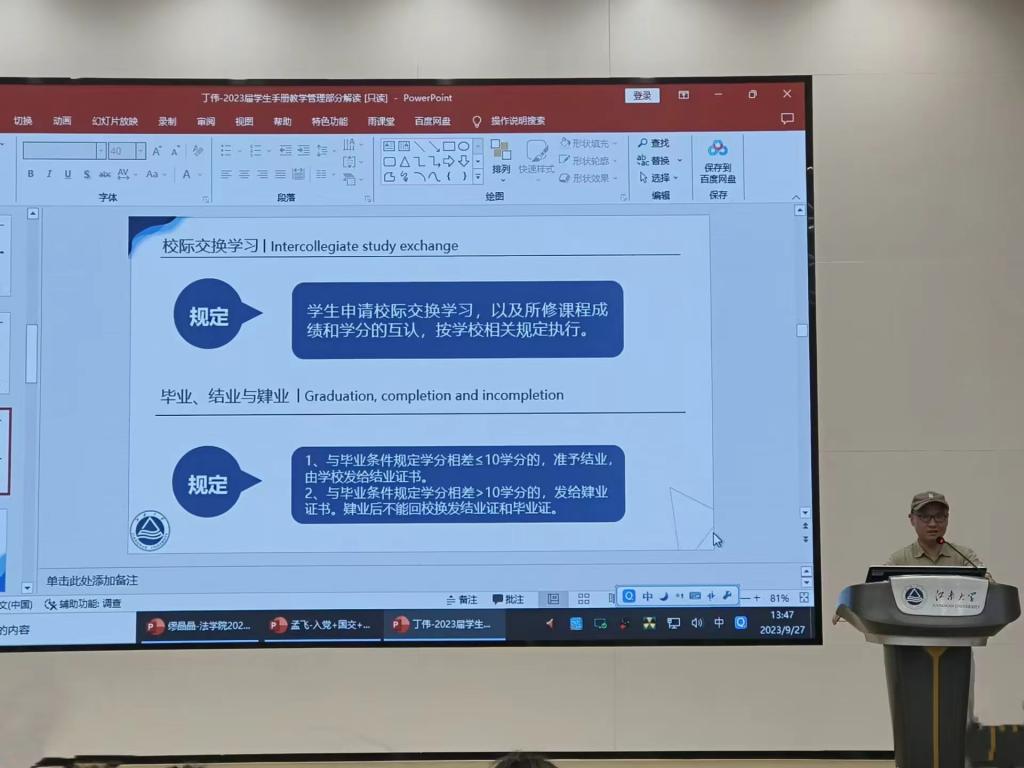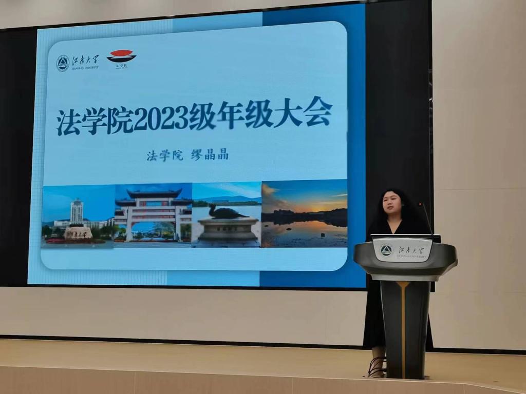 为促进新生顺利适应大学学习和生活,了解学校各项规章制度,增强对大学的认同感和归属感,以良好的精神面貌投入到新学期,9月27日下午,法学院召开2023级新生年级大会,为同学们开展学业考核、评奖评优、入党教育、海外交流等政策解读,帮助同学们做好大学规划,以饱满的热情与明确的目标投入新学期的学习和生活中。会议由辅导员缪晶晶主持,全体2023级新生参加了此次会议。