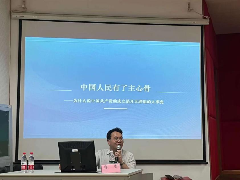 在“为什么说中国共产党的成立是‘开天辟地的大事变’?”一课中,马克思主义学院副教授郑宇首先对中国共产党的成立是历史的必然进行解释,指出马克思主义在中国的传播、工人阶级的觉醒、共产党早期组织的建立奠定了坚实的基础。他再说明了中国共产党的成立使中国革命面貌焕然一新。最后,郑宇指出中国共产党深刻改变了近代以后中华民族发展的方向和进程、中国人民和中华民族的前途和命运、世界发展的趋势和格局。