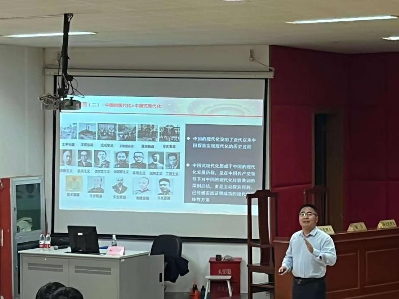 马克思主义学院副研究员白冰以“以中国式现代化全面推进中华民族伟大复兴”为主题,以党的二十大报告开场,从中国式现代化的历史逻辑、鲜明特色、本质要求、重要意义四个方面对中国式现代化进行解读。白冰指出中国式现代化的本质要求是领导力量+社会制度+“五位一体”总体布局的五大建设+对外交往+文明形态。最后,白冰再次强调 “只要找准正确方向、驰而不息,走好自己的路,就一定能实现现代化”这一现代化的发展观点,并通过交流互动为同学们答疑解惑。