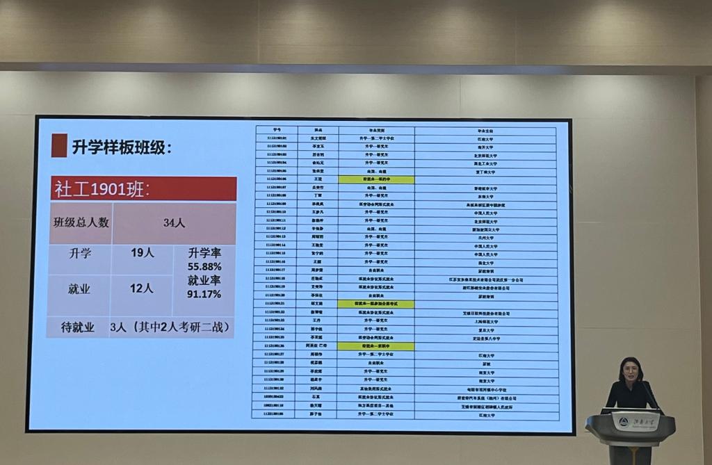 帕日旦木强调了召开本次年级大会的重要性,介绍了保研、考研、出国、就业等多种毕业去向选择,详细讲解了不同方向的优势和注意事项,强调了考研深造的必要性。她向同学们展示学院近三年的考研保研数据并进行分析,进一步解释考研升学形势,倡导同学们根据自身情况,尽早明晰未来目标。她详细介绍了我校保研细则、考研升学院校选择、考研复习方式方法等相关信息,并以社工1901班作为升学样板班级,强调了班风学风对于同学们发展的重要性,表示希望大家以社工1901班的学长学姐们为榜样,延续法学院的团结上进的优良传统,在升学上全力以赴,再创佳绩。