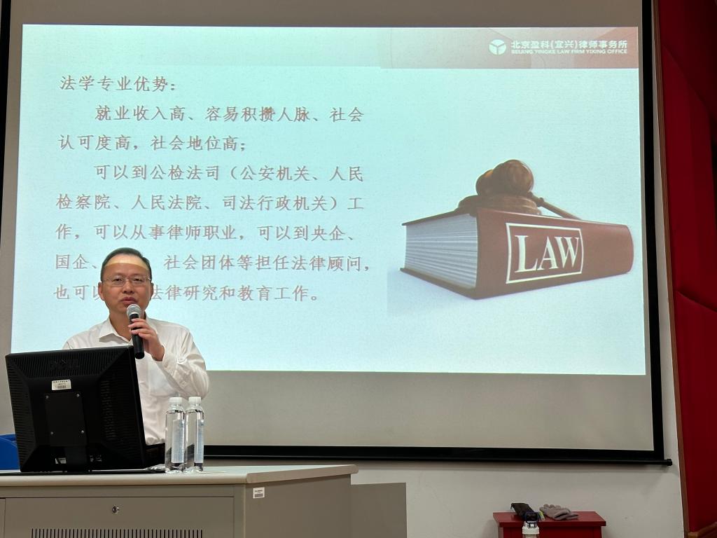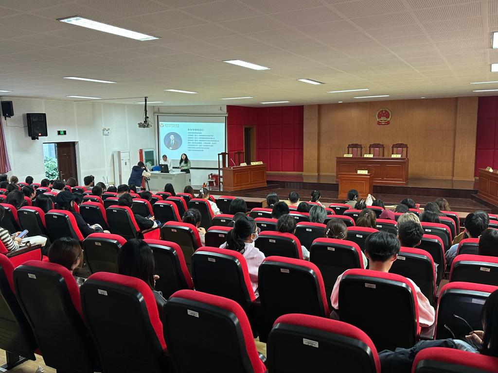 为提升学生对法学专业前沿、就业形势与职业规划的认识,树立良好学涯规划意识与能力,10月20日下午,法学院于模拟法庭开展德法力行讲坛第二十八期之大学生生涯规划专题讲座。本次讲座邀请北京盈科(宜兴)律师事务所朱华平律师作为主讲嘉宾,150余名学生参与了本次讲座,活动由辅导员缪晶晶主持。