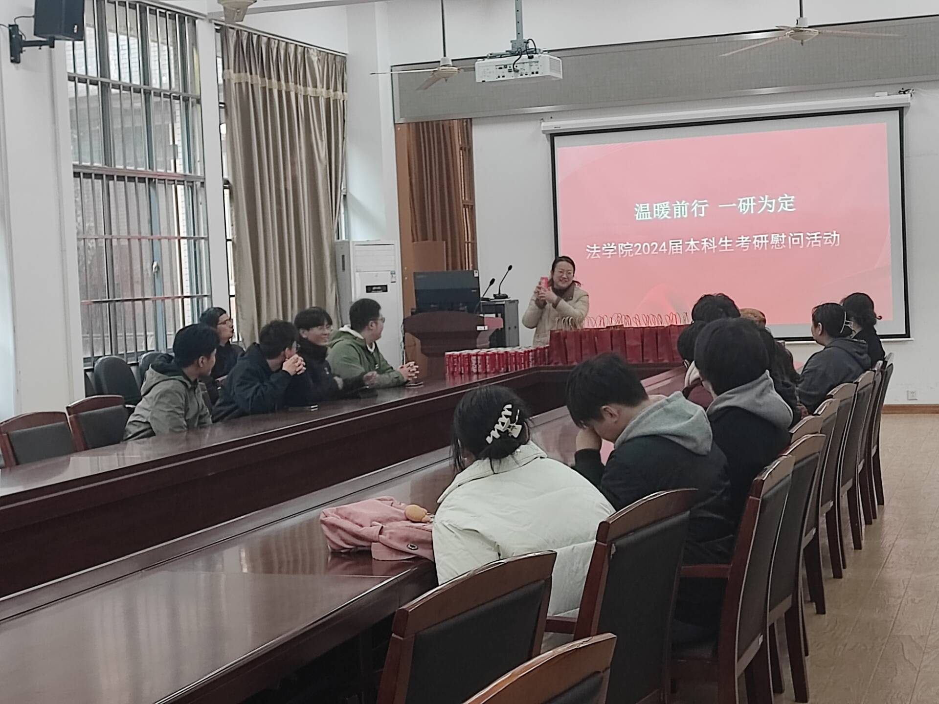 在2024年全国硕士研究生考试来临之际,为鼓舞学生信心,增强学生动力,法学院于12月6日下午在法学院B105会议室开展“温暖前行,一研为定”2024届本科生考研慰问活动。法学院领导给予高度重视,精心准备,学院党委副书记、副院长胡博、辅导员孟飞出席此次活动,代表法学院对全体考研学子表达关心和慰问,为考研学子加油鼓劲。