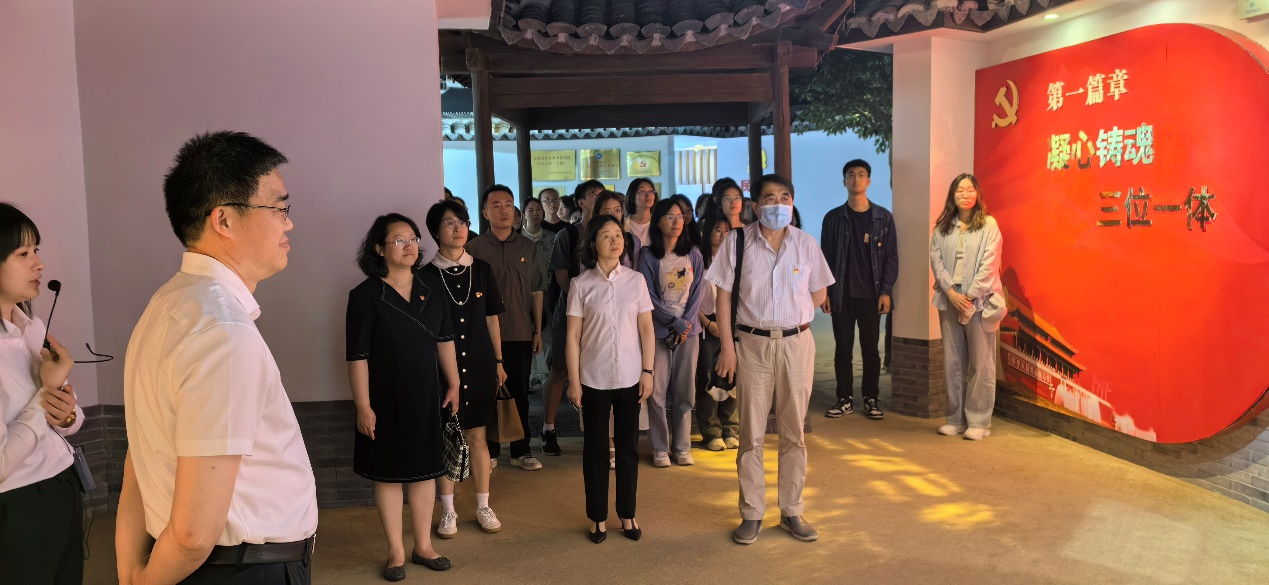 首先,法学院师生一行参观了红豆集团的党建展厅。红豆大学执行校长邓川借助丰富的图片、生动的视频和详尽的文字,深入介绍了红豆集团六十余载的辉煌发展历程及其取得的卓越成绩,同学们对红豆集团党委书记、董事局主席周海江的家国情怀和担当精神表示了崇高的敬意,深入学习了红豆集团党委如何精准把握政治定位,通过党建有效推动企业的建设与发展,将新时代的党建优势成功转化为推动企业高质量发展的强大动力。整个参观过程充分展示了红豆集团以高质量党建引领企业高质量发展的坚定决心与实践成果。随后,在红豆集团党员活动室进行了现场交流。胡博认为红豆集团的“一核心三优势”党建经验、“一融合双培养三引领”党建工作法和“五个双向”的党建工作机制值得学习,希望后续两方能就党建经验、做法、成果进行更加深入交流分享。