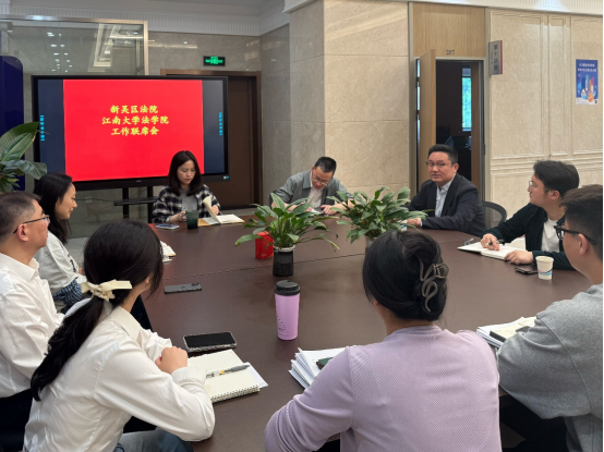 新吴区人民法院民二庭庭长严海涛介绍了区助企发展服务中心及企业重整服务中心的建设情况,提出了与法学院在法律金融复合人才培育、法学理论研究及大学生校外教学培训、志愿服务基地共建等方面的设想。陆秦介绍了学院在人才培养、学科建设、理论前沿研究等方面的基本情况,汇报了学院在咨询服务、普法宣传、学术研究等方面具备的资源及平台,以及近期服务地方司法机关的做法,并就如何发挥学院理论研究优势服务司法实践谈了看法。