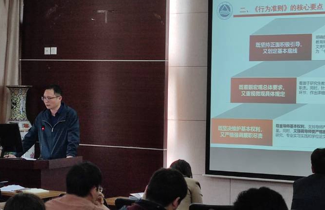 随后,邹华副院长宣讲了《研究生导师指导行为准则》,并提出了“加强宣传解读,确保全员知晓”“认真研究部署,确保落实见效”“强化监督指导,依法处置违规”的具体工作举措。