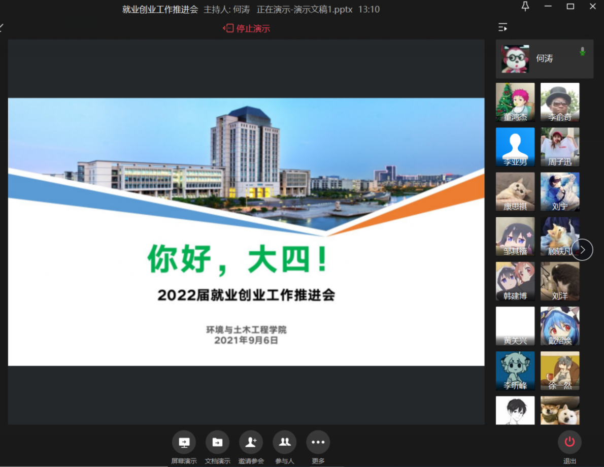 为提高2022届本科毕业生就业创业意识,9月6日中午,在前期汇总每位同学考研与就业意向的基础上,环境与土木工程学院利用线上平台召开2022届本科毕业生就业创业工作推进会,帮助同学们进一步认清当下就业形势,及早做好就业创业准备。本次会议由辅导员薛羚伟、何涛主讲,2018级全体本科生参与。