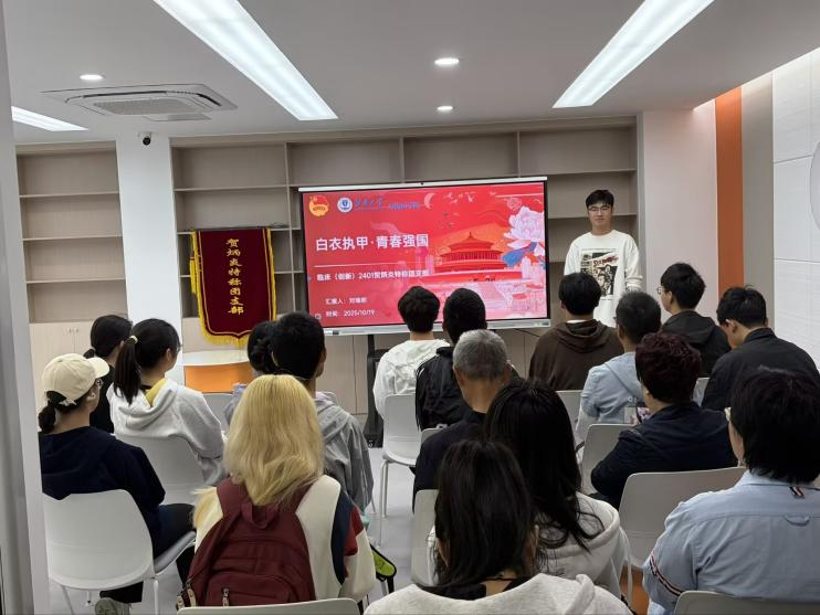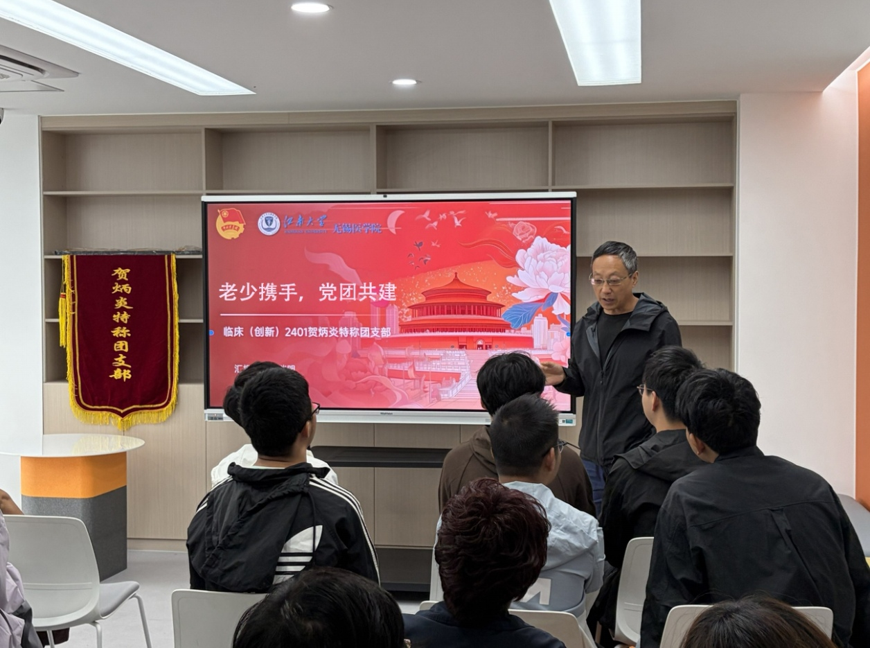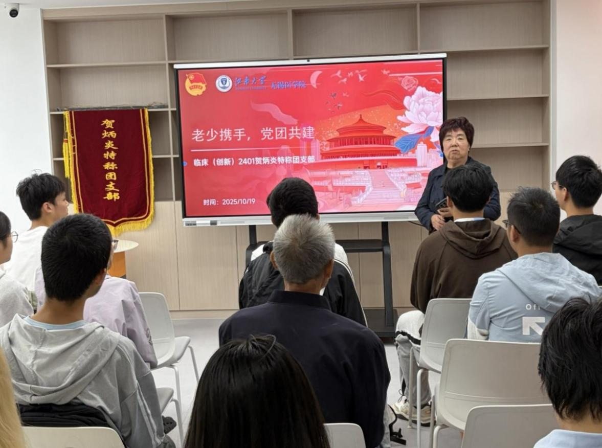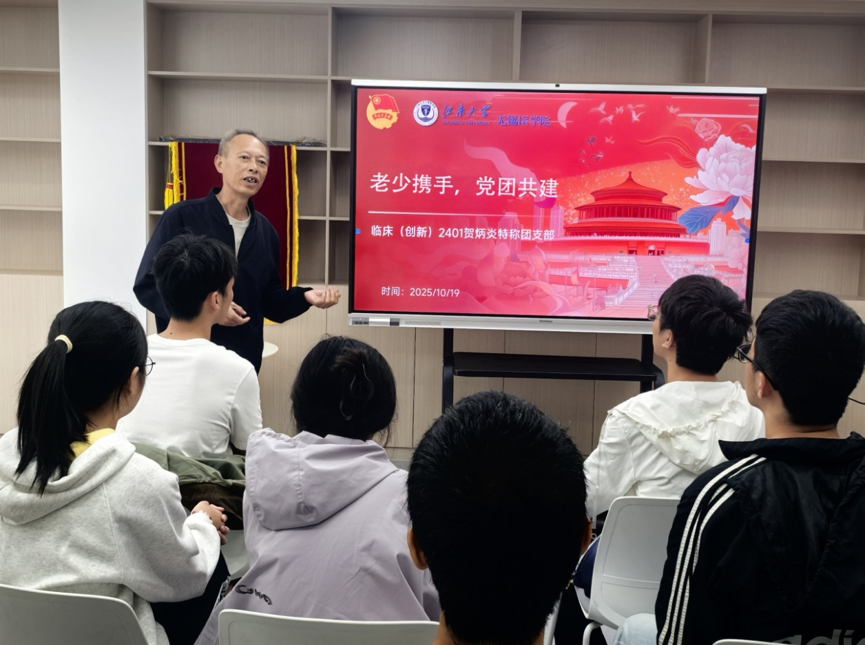 为激励广大医学青年赓续红色血脉、传承“红医精神”,坚定理想信念、勇担时代使命,10月19日,无锡医学院临床(创新)2401贺炳炎特称团支部携手江南大学离退休第六党支部,在澈苑“一站式”学生社区开展“白衣执甲庆国庆,青春奋进新征程”党团共建活动,举办了一场主题鲜明、内容丰富的“老少携手,党团共建”学习交流会。