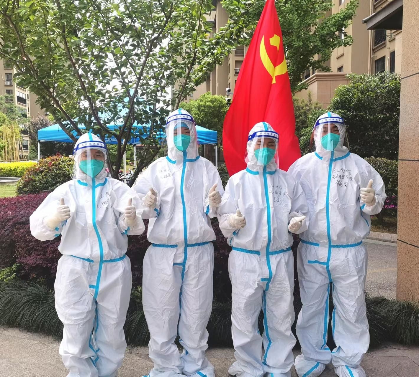 在奋战的16天里,无锡医学院抗疫采样队员不辱使命,连续作战,当天来回往返,多次凌晨3、4点起床,足迹从张家港走向昆山,涉及10个镇、27个社区。队员们每日穿着闷热不透气的防护服、戴着勒得非常紧的口罩,不惧炎热,无畏风雨,每天平均采样时间是6小时,承担着高强度的核酸检测任务和心理压力,女教师还需克服身体应激反应、生理期等各种不适。采样期间,队员们曾合力抢救晕厥女孩,被当地群众称为最美大学老师;他们也因采样手法比较柔和,说话比较温柔,被当地社区人员夸赞与其他“大白”有点“不一样”,得到了当地群众的一致认可。虽然采样期间很多队员出现了脱水症状,因长期闷在面罩和口罩里身体出现了外伤;虽然经常饿到下午2点钟还没吃饭,有时拿方便面充饥,甚至找不到一处可以坐下来吃饭的地方;虽然家里还有嗷嗷待哺的幼儿,还有老人需要照顾,但是来自学校的关怀让他们勇往直前,家里的支持成为他们拼搏的“铠甲”。此刻他们不仅仅是师者,还是医者,他们用自己的行动诠释了医者的使命担当,用自己的行动为学生树立了榜样。他们也因敢吃苦、能战斗,团结一致、听从指挥,各方面表现突出受到了省卫健委张金宏副主任和人事处李博处长的表扬和肯定。
