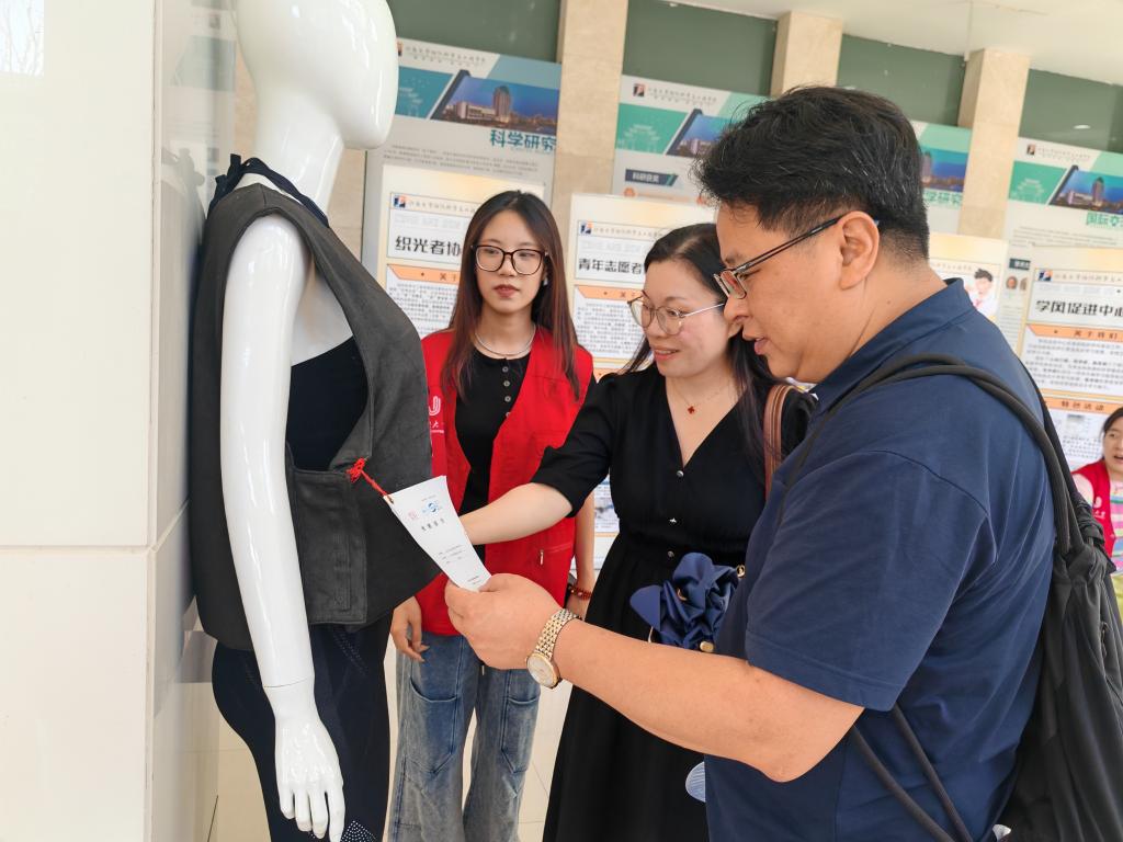 科技赋能,前程引领——现代纺织科技成品展。在科技成果展厅,服饰、医疗、军事等多领域的纺织科技产品依次陈列,双面织物、一体成型衣物、人造血管、防弹服、变色织物等前沿科技成果令新生眼前一亮。通过实物展示与专人讲解,新生直观感受到“问天探海,万物可织”的现代纺织魅力,增强专业自信心与认同感。