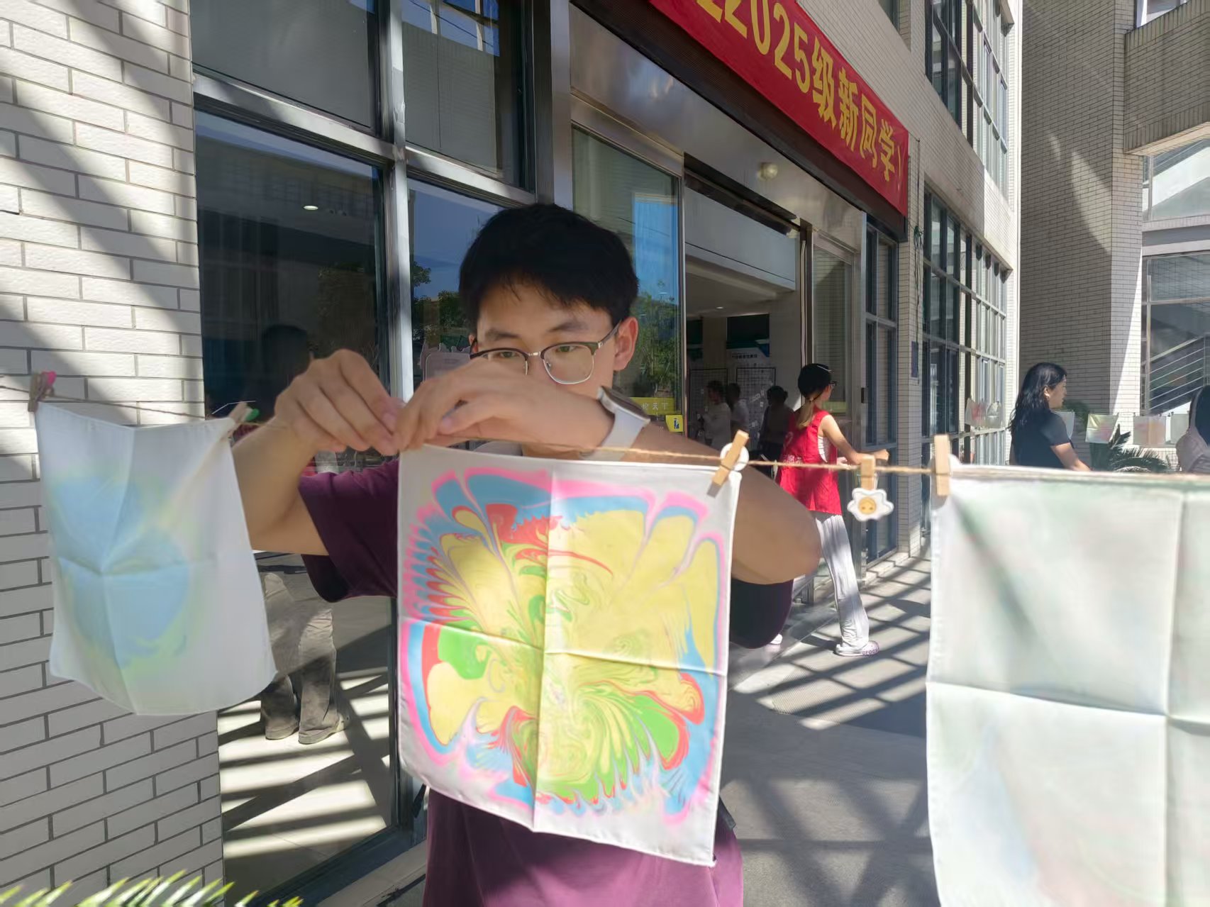 非遗润心,丝韵传承——水拓丝巾非遗文化体验。在非遗传承互动区,新生亲手调色、水拓、创作,完成属于自己的水拓丝巾。这不仅是一次美育体验,更是一场心灵与传统文化的对话,心理健康教育与非遗传承使命在此得到了完美融合。