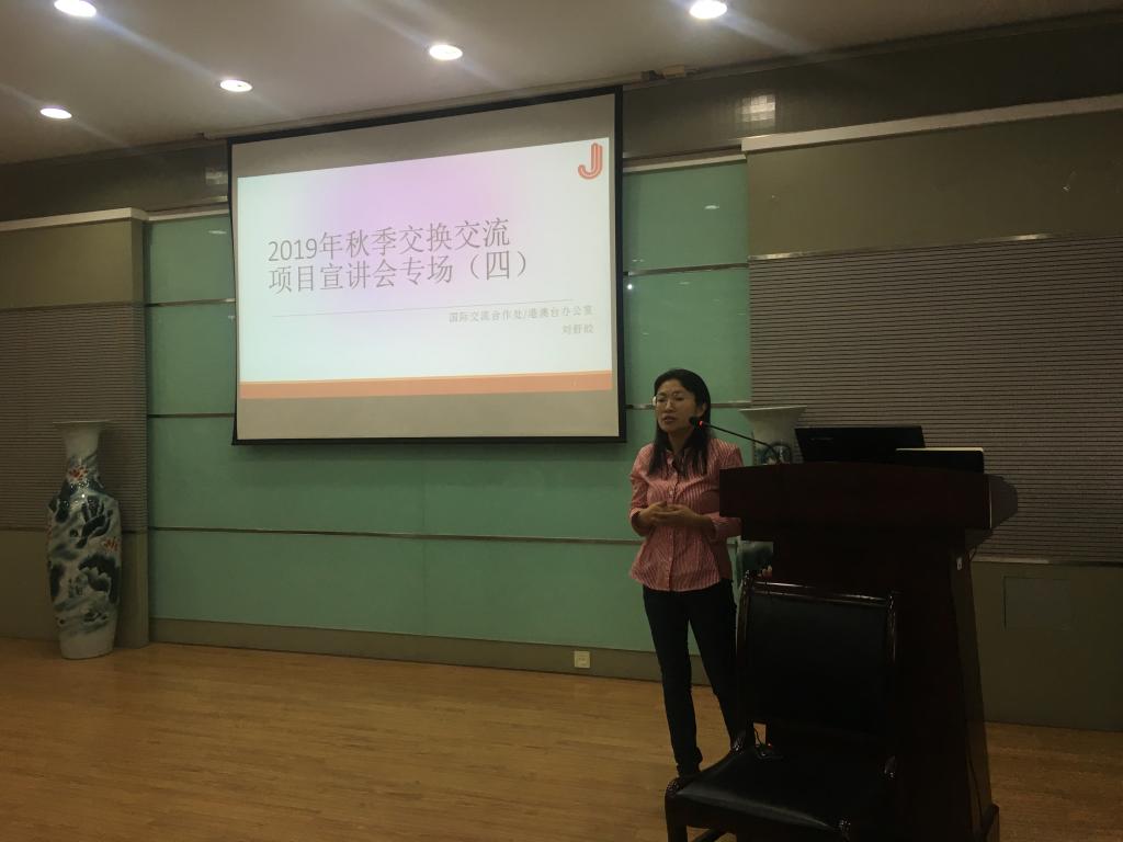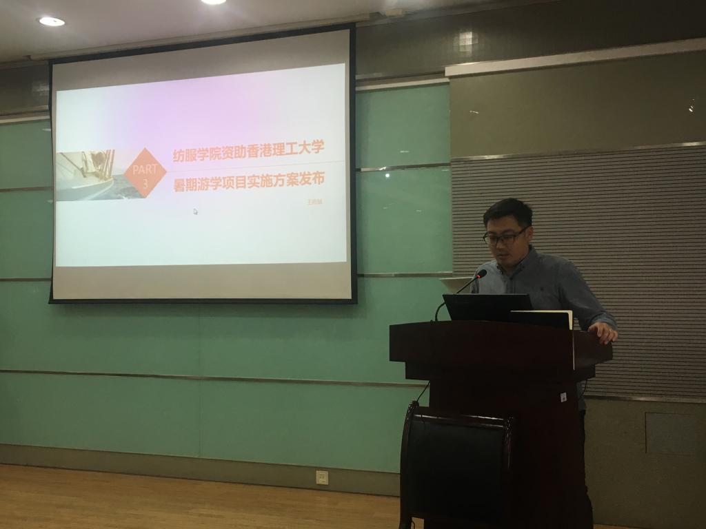 王统斌讲解了《纺织服装学院香港理工大学暑期游学项目实施方案》进行说明。祖雅妮和黄晓璇作为2019寒假香港理工大学访学团优秀成员为与会学生带来心得分享。权晶老师就2019暑期韩国蔚山大学访学项目开展宣讲。徐雅静老师解读纺织服装学院海外游学类奖励条例,包括海学奖和联培奖。