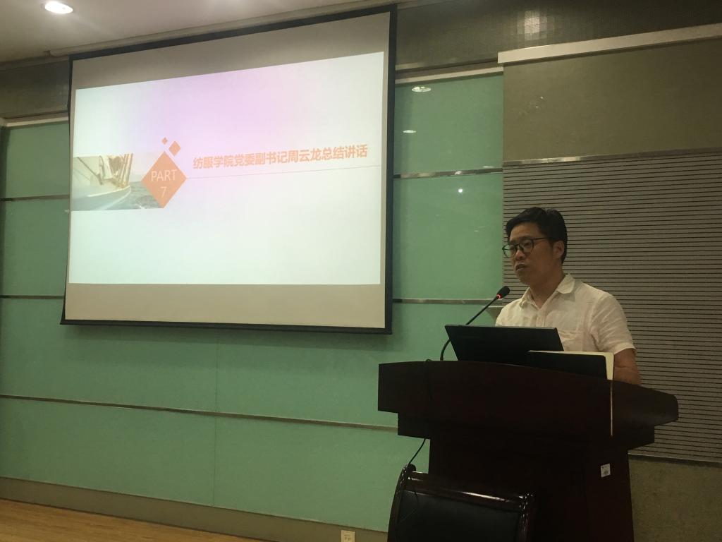 周云龙作总结发言。他表示,近年来,学校在创新人才培养模式上做出了很多探索,取得许多成绩。学校始终把“立德树人”作为根本任务,十年树木百年树人,学生的成长在点滴灌溉之中,在润物无声之处。我们通过类似的推动学生国际交流等工作,为大家提供了广阔的平台,鼓励支持纺服学子走出国门拓展视野。作为纺织服装学院的学生,要提高参与国际交流的意识,学习和借鉴国外的先进理念、经验和技术,提升专业水平、提高实践能力,学会国际比较,早日成为具有国际竞争力的行业高端人才。新时代,我们大学生应该有新作为,应当拥有更高的视野和更宽的胸怀,努力学习,为早日实现“两个一百年”奋斗目前贡献自己的青春才华。