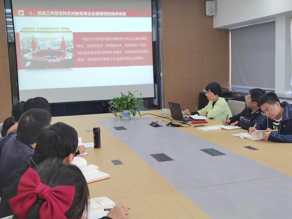 首先,陈艳君以“思想政治工作是学校各项工作的生命线”为题,从加强学校党的政治建设的重要意义、思想政治工作贯穿教育教学全过程的生动实践、办好思想政治理论课的几点要求、牢牢把握党对教育领域意识形态领导权、培养优秀政工队伍五个方面阐释了在高校中开展思想政治工作的理论必要性与实践科学性。其中,她特别强调了要牢牢抓住“三全育人”的理念,结合学院特色,以学科竞赛为媒介,打造学、研、创、赛相融合的教育体系,充分发挥党组织在教育工作中的领导作用。