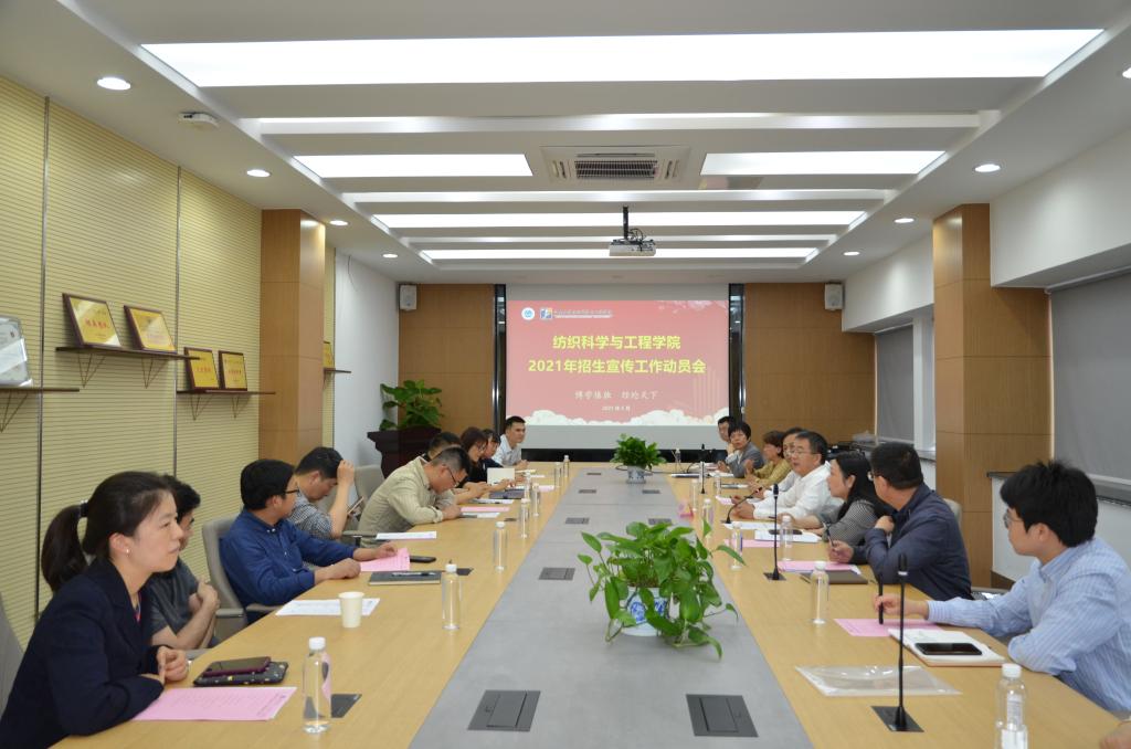 为深入贯彻学校关于本科招生工作的部署要求,统筹落实2021年招生宣传工作。5月26日下午,纺织科学与工程学院在学院A306会议室召开2021年招生宣传工作动员会。招生就业处处长赵建新、纺织学院全体院领导、招生就业处吴琰嘉、李金杰以及学校四川招生组、江苏南通招生组全体成员参加会议,会议由学院党委副书记陈艳君主持。