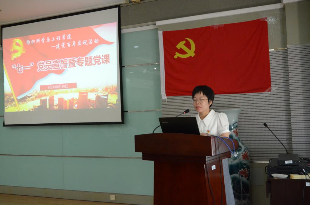 百年风雨颂红船,一片丹心日月明。站在建党100周年的时间节点上,为重温党的光辉历史,鼓励新老党员学史明理、心中有党、爱党敬党,6月30日下午,纺织科学与工程学院党委开展建党100周年庆祝活动,举行“七一”党员宣誓暨专题党课。全体党委委员、教工党员、学生党支部委员及全体新发展党员150余人齐聚一堂,共庆建党100周年,大会由院党委副书记陈艳君主持。