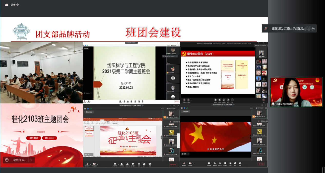 活动中,五校共建学院党委副书记分别致辞讲话,纺织科学与工程学院党委副书记陈艳君在致辞中对本次活动提出三点希望:一是希望学习到兄弟高校宝贵的党建、团建方面的先进做法和经验;二是希望同学们在活动中得到思想的启迪、精神的升华、格局的提升;三是希望我们“这一次”的“屏对屏”,尽快实现“下一次”的“面对面”。同时,五校共建学院团委书记、党支部书记、团支部书记分别就团学共建、党支部共建、团支部共建交流发言并在各自分会场进行分享研讨,纺织科学与工程学院分团委书记陈裕老师从“思想引领”“组织建设”“创新创业”“社会实践”“志愿服务”“校园文化”“年度创新”等维度介绍学院共青团工作开展情况,陈裕还分享了关于纺织类高校共青团工作的几点思考:共青团工作如何与学科发展、文化传承有机结合需进一步搜索;共青团工作品牌创建任重且道远,宣传方法与形式需推陈出新;共青团工作应在学生“输入”与“输出”平衡中提升贡献度。我院20纺硕党支部书记江洋同学,在会上介绍到“研本互动”“三大系列活动”“特色党小组创立”等支部特色,并提倡以后要多多开展党支部之间的“经验交流”“资源和成果共享”活动。轻化2103班团支部书记赵佩煜同学分享了担任团支部书记近一年来的工作任务和工作方法,以及取得的工作成效。