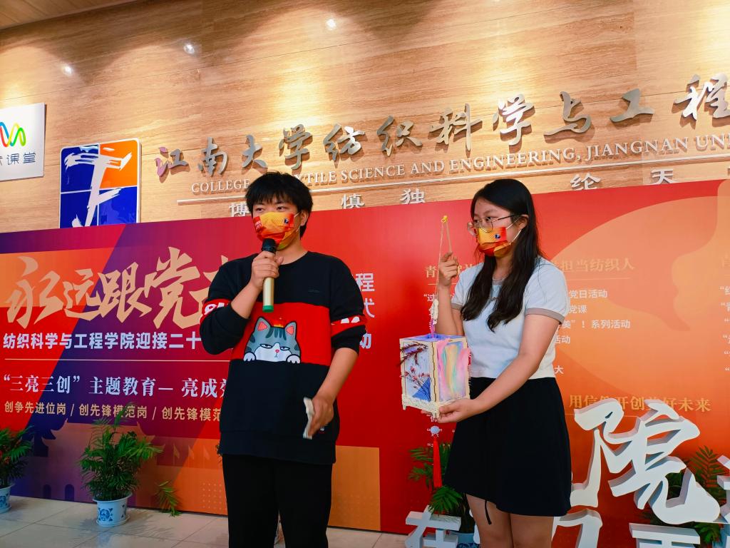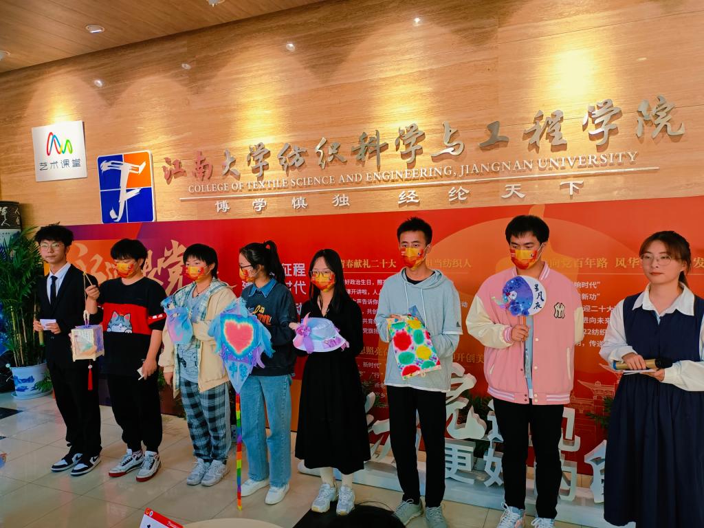 本次“青春芳华”创意扎染设计大赛2.0以“织青春锦绣,染飞彩流年”为创作主题。各参赛队围绕“青春心向党”“风景旧曾谙”“国风万古存”三个方向,使用统一分发的材料,运用不同的扎染手法,结合自己的灵感创意与生活体验,分别在布料上对爱党爱国、江南好风景以及传统文化的传承这三方面进行创作。参赛队运用染好的布料对一些常见的物品进行装饰,通过体验传统染整工艺技术的魅力以及通过设计、装饰来将传统工艺与普通物品相结合,从而碰撞出一场震撼人心的视觉盛宴。“大橘今天吃包子了吗队”用淡紫色渲染出凌霜傲然的不败秋花,辅以装饰,最终绽放于小巧玲珑的灯笼之上;“啊对对对队”用鲜艳的色彩,染出了关于女娲补天的内容创作,表达出对国潮兴起、国风永存的展望;“干什么都队”用一颗爱国爱党的赤诚之心装饰出一面风筝,寓意放飞理想向未来;“三元一次方程组队”以黛紫、官黄相互结合,染出独具韵味的江南春色;“你说的都对队”以孔雀石绿、玫红、明黄为主题色创作,将染布呈现于笔帘之上,体现出一种自然融合的美感;“你说的都对plus队”依托于繁星密布的浩渺星空,并与团扇有机结合,诠释出无限遐想的中国传统之美。这些优秀参赛作品传递出江南学子爱党爱国爱校的深厚情怀,展现了纺织青年敢于创新的精神风貌,丰富了同学们的课余文化生活,提高了青年学子的艺术审美修养和艺术表现才能。