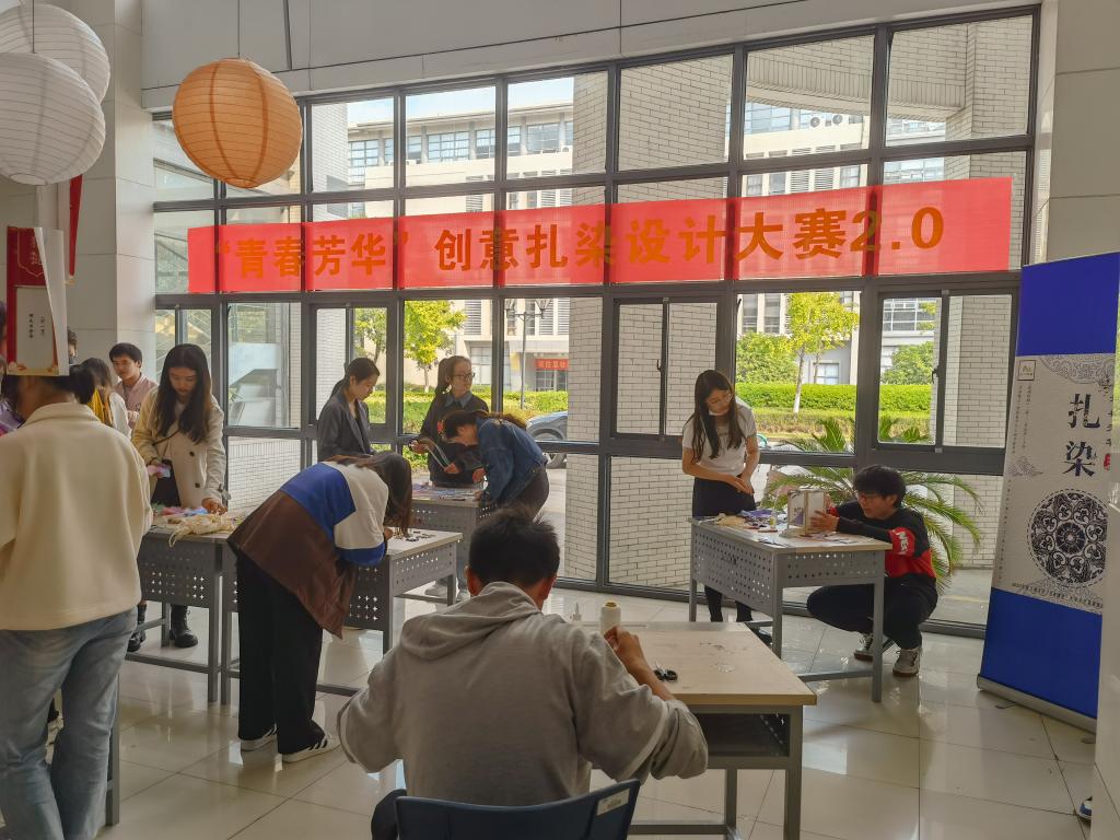 为学习贯彻党的二十大精神,充分发挥“艺术课堂”在校园文化建设中的重要作用,打造校园原创文化文艺作品和艺术展演展示项目。10月23日下午,纺织科学与工程学院在学院A区一楼大厅举办“青春芳华”创意扎染设计大赛2.0,该比赛入选“奋进新征程•建功新时代”2022年度江南大学“艺术课堂”校园文体艺术实践项目。活动邀请了学院轻化工程系苏静老师、顾鹏老师、司鹏翔老师以及学院分团委书记陈裕、学院兼职辅导员王傲和学院学生会胡紫瑞同学担任点评嘉宾,参赛团队同学及大众评审共计50余人参加。