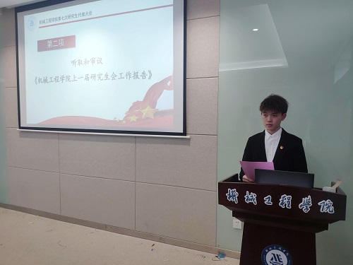 会议的第一项议程是奏唱国歌,嘹亮的歌声拉开了会议的序幕。首先,会议听取和审议了机械工程学院上一届研究生会工作报告。机械学院研究生会执行主席王剑宇代表第六届研究生会作了题为《把握时代思想,谱新篇,共成长》的工作报告,报告中他回顾了过去一年院研究生会的工作,总结了研会工作的不足之处,并对未来一年院研究生会的工作方向和目标作了展望。