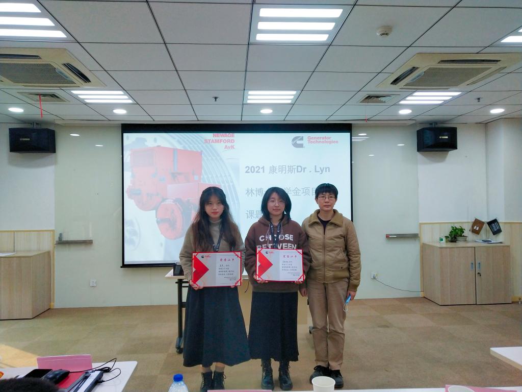 随后,六个小组依次上台答辩,同学们思维活跃、想法大胆、逻辑缜密、表达流利,与在场的评委们不断碰撞出火花,赢得阵阵掌声和不断好评。最终,经过评审,夏斯璇、孟卓、吕青、吴菁柯、林丽英、常冰冰、罗凯迪、龚晓硕、邱轩9名同学获得2021-2022学年度“康明斯林慰梓博士奖学金”,康明斯发电机技术(中国)有限公司工厂ME经理刘锋,ME经理沈娆洁和CR主席陈倩云分别为三组同学颁奖。