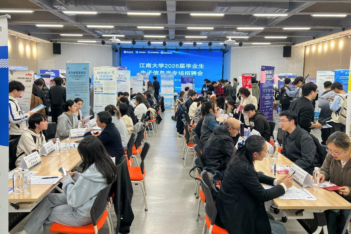 为深入贯彻落实党中央、国务院和江苏省委、省政府关于做好高校毕业生就业工作决策部署,抢抓秋季促就业工作关键期,全力推进毕业生高质量充分就业,11月7日下午,江南大学“电子信息类”2026届毕业生专场招聘会在北区大学生活动中心招聘大厅举办。本次招聘会由物联网工程学院、人工智能与计算机学院、集成电路学院联合举办。