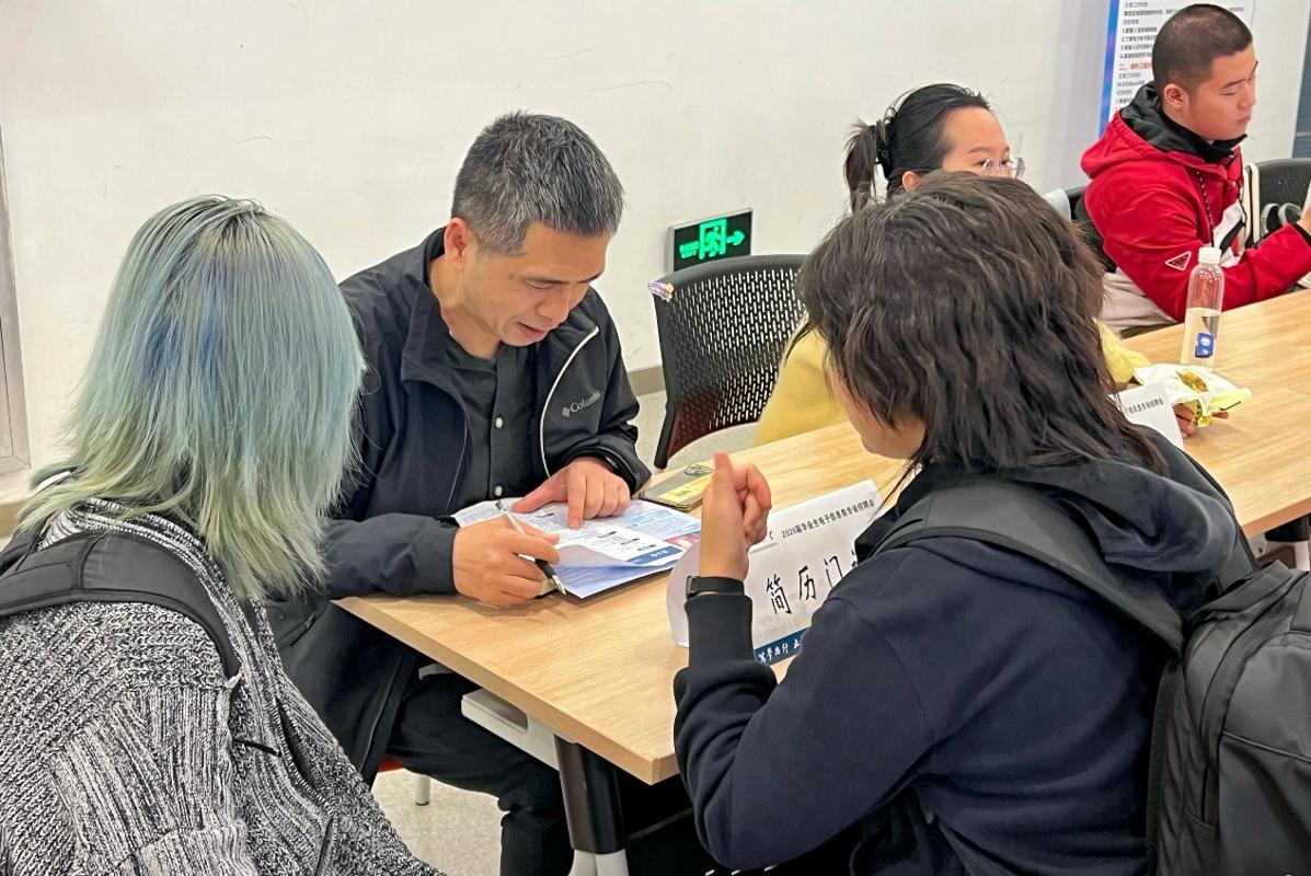 各企业单位向求职学生热情介绍自身企业文化、招聘需求、福利待遇、产业结构等,真诚邀请学生加入。求职学生认真聆听,与用人单位充分交流,积极投递简历。双选会现场设置“简历优化”“征兵咨询”“留学咨询”“导向就业”等多个服务专区,为毕业生顺利步入职场提供全过程、全方位的帮扶与支持。各承办学院毕业班辅导员、班主任和部分专业教师也在现场与用人单位进行主动对接,向用人单位积极推介优秀毕业生。