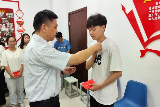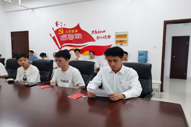 活动在庄严的国际歌声中拉开帷幕,随后,张华、陈祎为新党员代表佩戴党员徽章、赠与党章。全体党员重温了入党誓词,铮铮誓言,字字铿锵,在鲜艳的党旗下,表达了每一名党员对党的无限忠诚和为共产主义事业奋斗终生的决心。