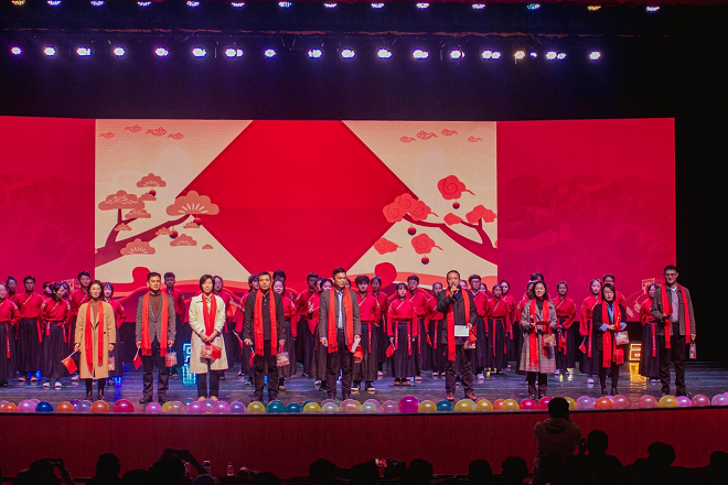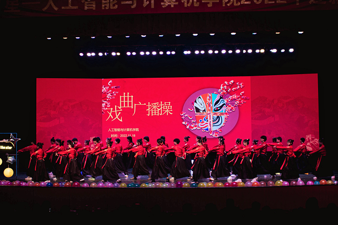 晚会在“嬉皮纵火案”乐队的歌声中拉开帷幕,动感的旋律瞬间点燃全场师生的热情。首先,刘渊致辞,他回顾学院2022年在全院师生共同努力下取得的突出成绩,并寄语2022级智能学子要坚定理想信念、心系伟大祖国、勇于砥砺奋斗,求真学问、练真本领,以饱满的精神状态迎接大学生活。接下来,获得2022年度“戏曲广播操”大赛二等奖的学院学生团队向观众呈现了一场编排出色、整齐划一的精彩表演,随后,院领导、老师通过一段深情而有力的朗诵寄语智能学子并向台下师生分发新年糖果,将晚会推向高潮。