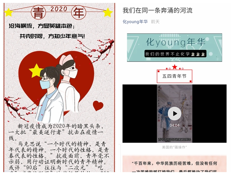 突如其来的疫情,是一次全球大考,也是一堂“面对突发疫情青年人该怎么做”的生动课程。疫情期间,化工学子虽居于一隅却始终保持世界眼光,密切关注世界疫情发展趋势,冷静分析世界变幻格局,细心收集,客观研判。分团委各部门联合制作微视频《我们在同一条奔涌的河流》,于5月4日当天在学院微信平台推出。视频以独特的青年视角和生动幽默的语言析说疫情中的“中美方案”,剖析疫情彰显出的制度优势、道路优势,引导广大共青团员牢记“四个意识”,坚定“四个自信”,做到两个维护,将青春梦想融入时代担当,立志为实现中华民族伟大复兴做出更大的贡献。